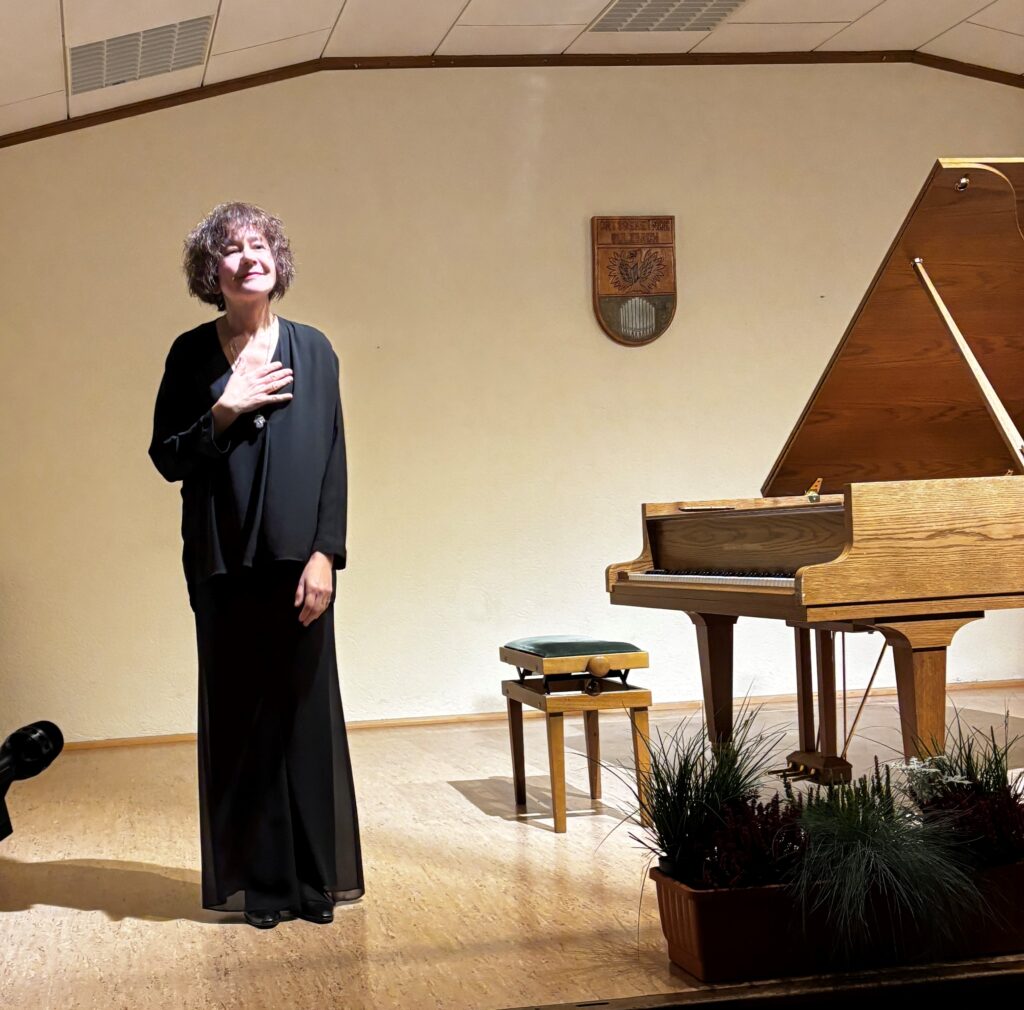 Nach der langen Pause, die den Gästen weiter die Möglichkeit gab die Ausstellung anzuschauen und sich auszutauschen, ergriff wieder Schneider das Wort („Ich habe meine Notizen stark gekürzt“), weil es ihm ein Bedürfnis war die Zuhörerschaft in das Werk des zweiten Teils, die „Goldberg-Variationen“ von Johann Sebastian Bach einzuführen. Er ging auf wichtige Interpreten dieser „Clavier-Übung zum Ergetzen…“ ein und stellte dann den Bezug zu Felix Mendelssohn her, der als Zwölfjähriger mit Bach‘sche Musik Johann Wolfgang von Goethe ergötzt hatte. Die 30 Variationen verlangen nicht nur von der Künstlerin mentale Höchstleistung, sondern fordern auch den Intellekt des Zuhörers. Da hatten Schneiders Worte und sein kleines „Arbeitsblatt“ gute Hilfestellung geleistet. Das Werk dauert so lange wie eine klassische Sinfonie. „Ich war durchweg gebannt, hatte keine Mühe aufmerksam zu bleiben,“ freute sich eine Dame und sprach für wohl alle begeisterten Menschen im Saal. „Mir ist es wichtig mit diesem Abend gegen das Vergessen zu helfen.“ Mit diesem Satz verabschiedete sich die Künstlerin, gerührt vom starken Beifall und der Bewunderung, die man ihr zollte.