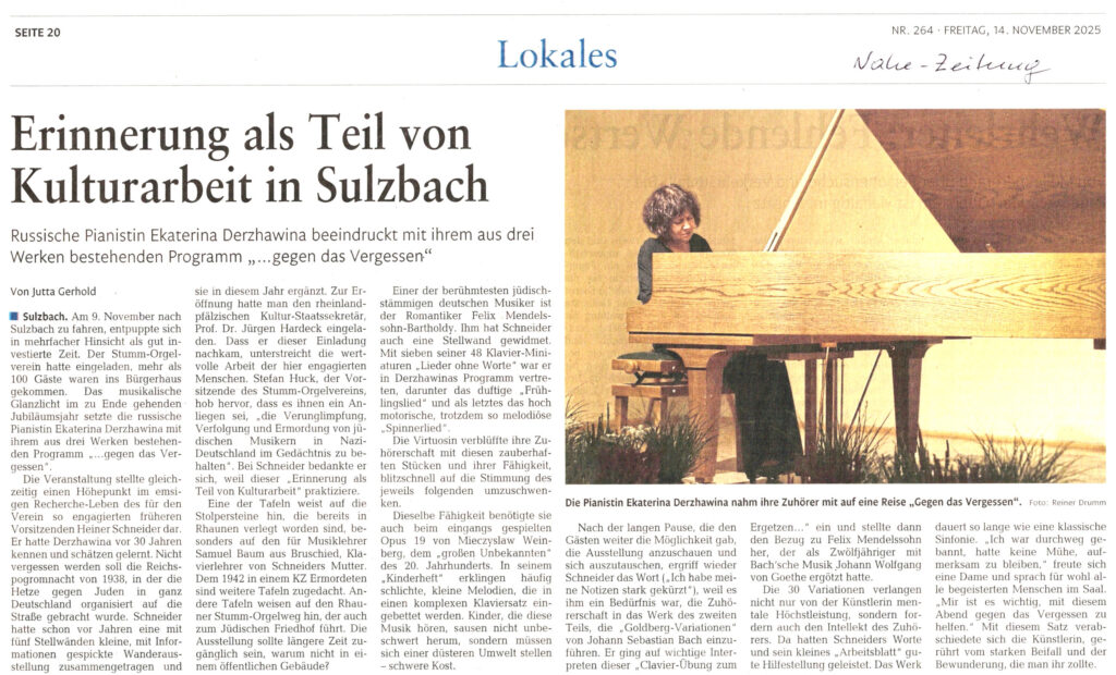 Das musikalische Glanzlicht im zu Ende gehenden Jubiläumsjahr setzte die russische Pianistin Ekaterina Derzhawina mit ihrem aus drei Werken bestehenden Programm „…gegen das Vergessen“. Die Veranstaltung stellte gleichzeitig einen Höhepunkt im emsigen Recherche-Leben des für den Verein so engagierten früheren Vorsitzenden Heiner Schneider dar. Er hatte Derzhawina vor 30 Jahren kennen und schätzen gelernt. Nicht vergessen werden soll die Reichspogromnacht von 1938, in der die Hetze gegen Juden in ganz Deutschland organisiert auf die Straße gebracht wurde. Schneider hatte schon vor Jahren eine mit fünf Stellwänden kleine, mit Informationen gespickte Wanderausstellung zusammengetragen und sie in diesem Jahr ergänzt. Zur Eröffnung um 16 Uhr hatte man den rheinland-pfälzischen Kultur-Staatssekretär, Prof. Dr. Jürgen Hardeck eingeladen. Dass er dieser Einladung nachkam, unterstreicht die wertvolle Arbeit der hier engagierten Menschen.
