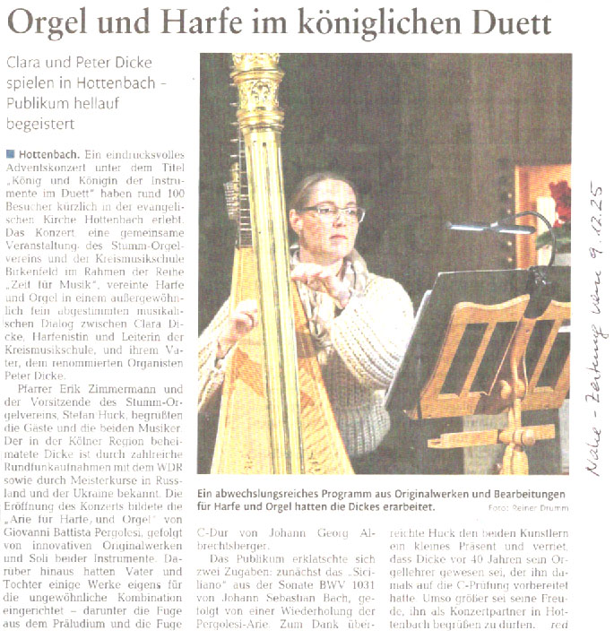 Rund 100 Besucherinnen und Besucher erlebten am 29. November um 17 Uhr in der evangelischen Kirche Hottenbach ein stimmungsvolles Adventskonzert im Rahmen der Reihe „Zeit für Musik“. Unter dem Titel „König und Königin der Instrumente im Duett“ musizierten Clara Dicke (Harfe) und Peter Dicke (Orgel) in einem fein abgestimmten Zusammenspiel, das das Publikum sichtbar berührte. Auch der Landrat des Landkreises Birkenfeld, Miroslaw Kowalski, war unter den Gästen.